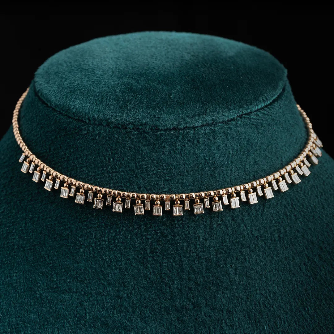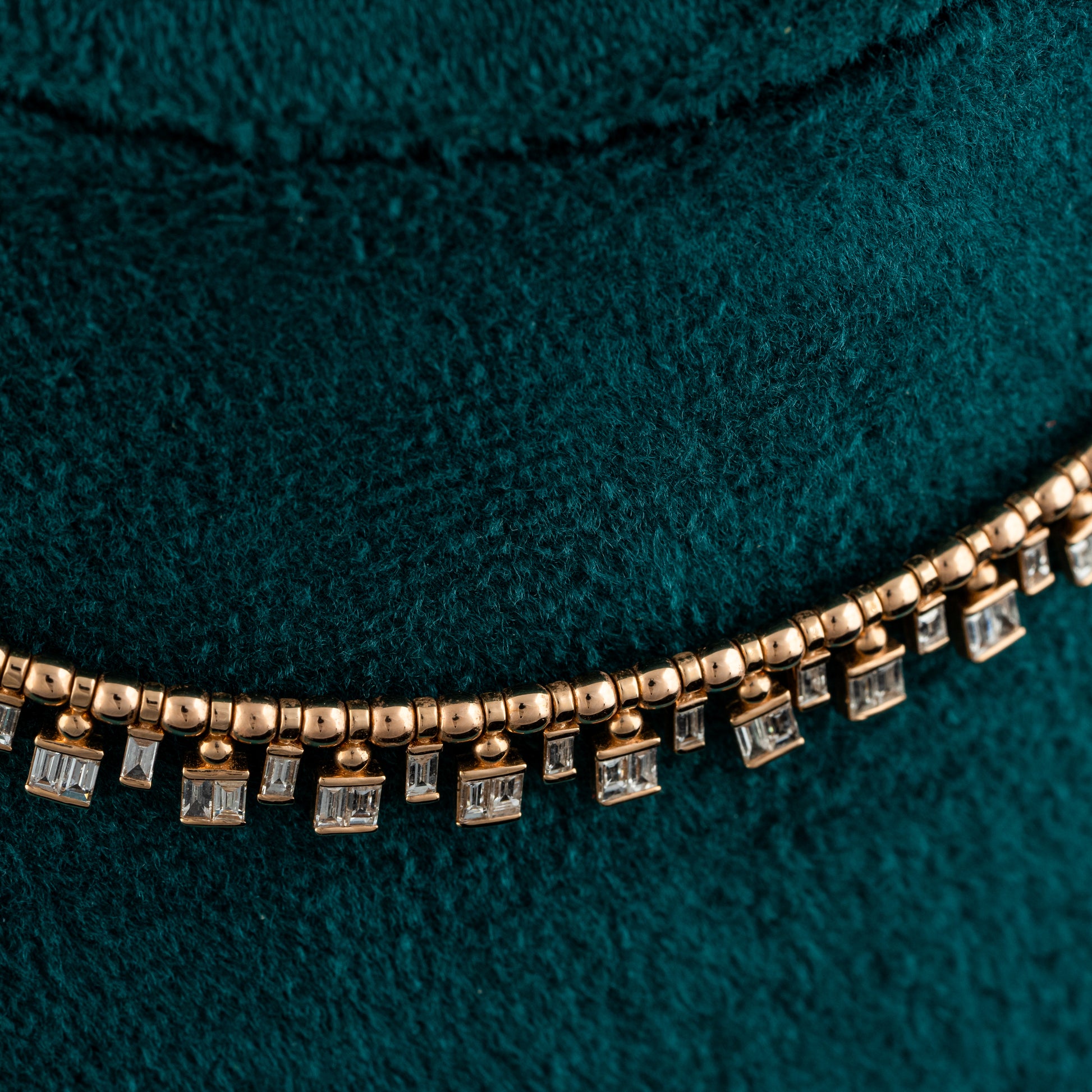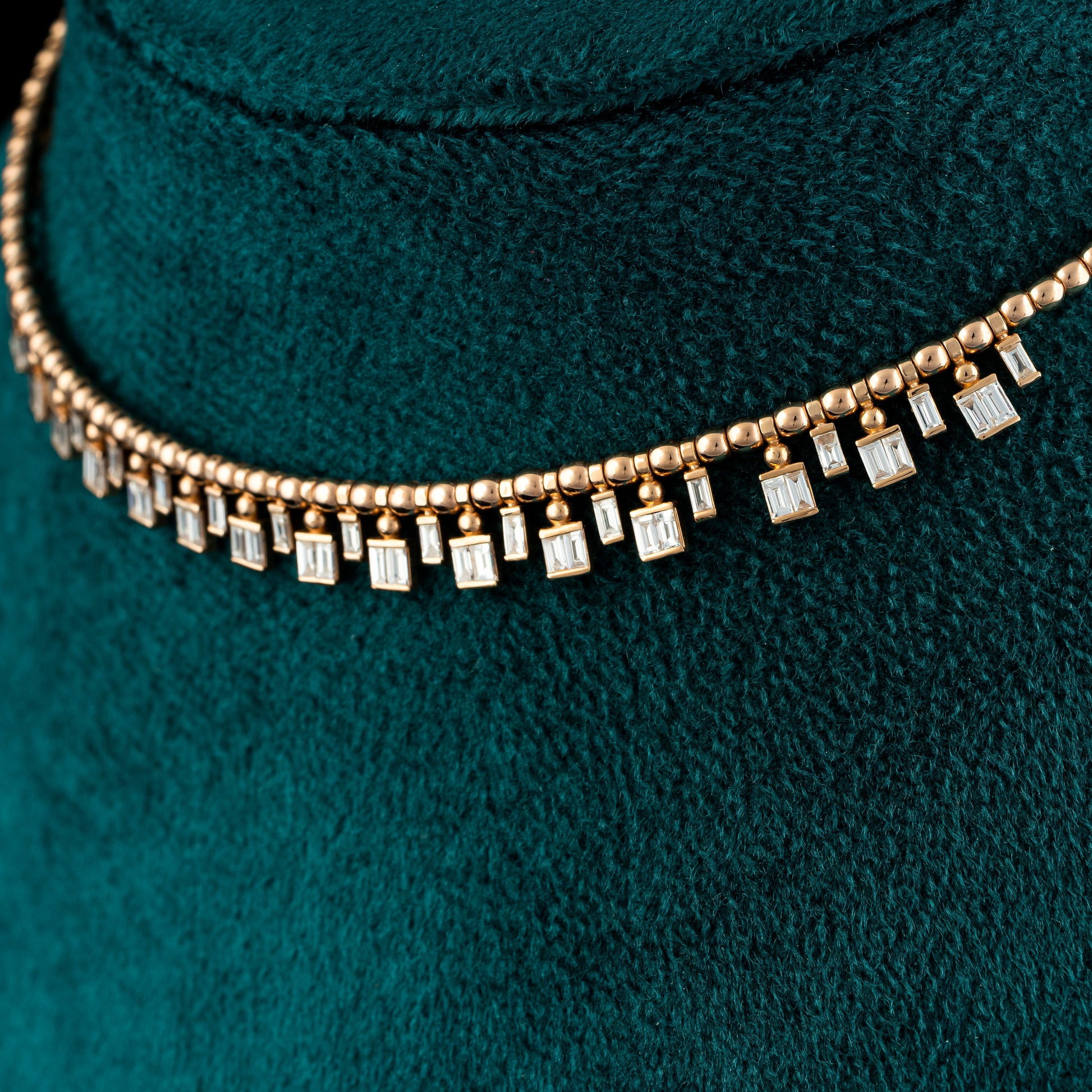 This elegant necklace features a delicate gold chain adorned with rectangular, baguette-cut diamonds, each set in a sleek vertical bezel. The diamonds are uniformly spaced and hang gracefully, creating a fringe-like effect. The contrast between the warm gold of the chain and the cool brilliance of the diamonds enhances its luxurious and timeless appeal.