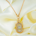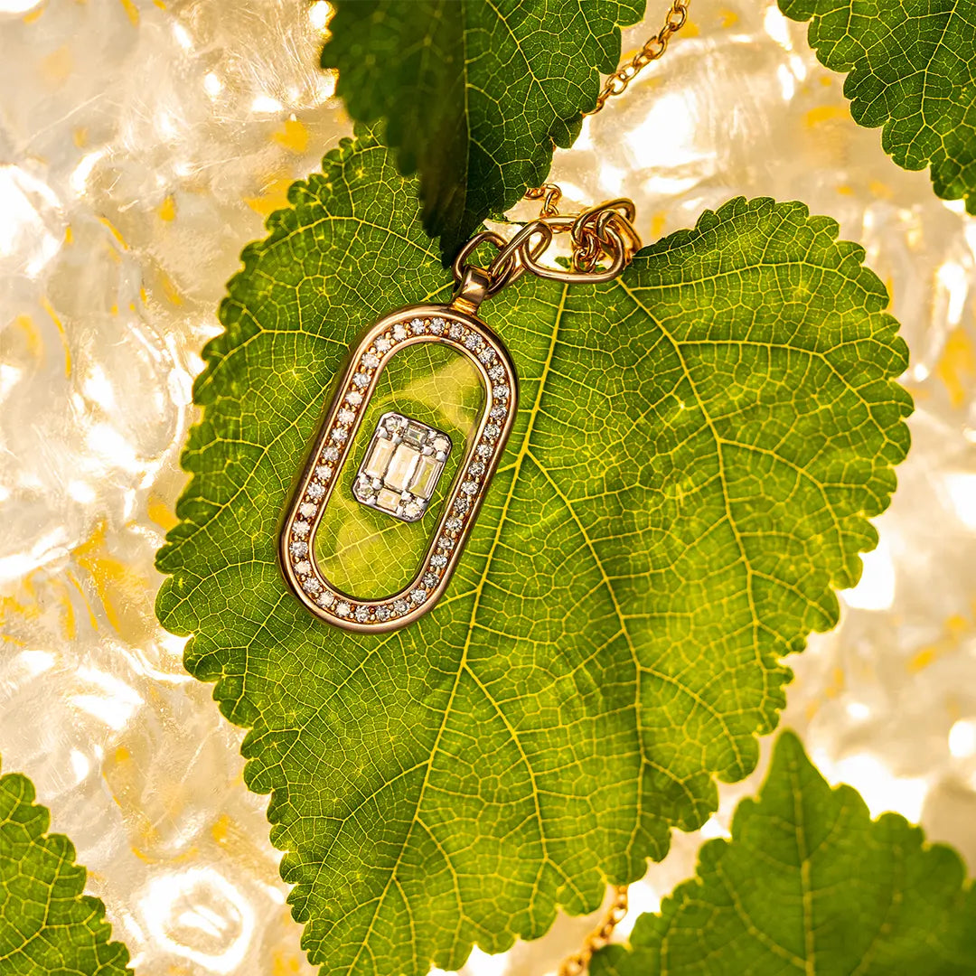 The necklace features a captivating diamond pendant set in a delicate rose gold chain. The pendant showcases an oval-shaped frame embellished with a row of sparkling diamonds. At the center of the frame, a stunning emerald-cut diamond takes center stage, radiating elegance and luxury. The combination of the round-cut and emerald-cut diamonds creates a sophisticated design. The overall colour of the diamonds is white, contrasting beautifully against the warm tones of the rose gold setting.