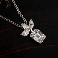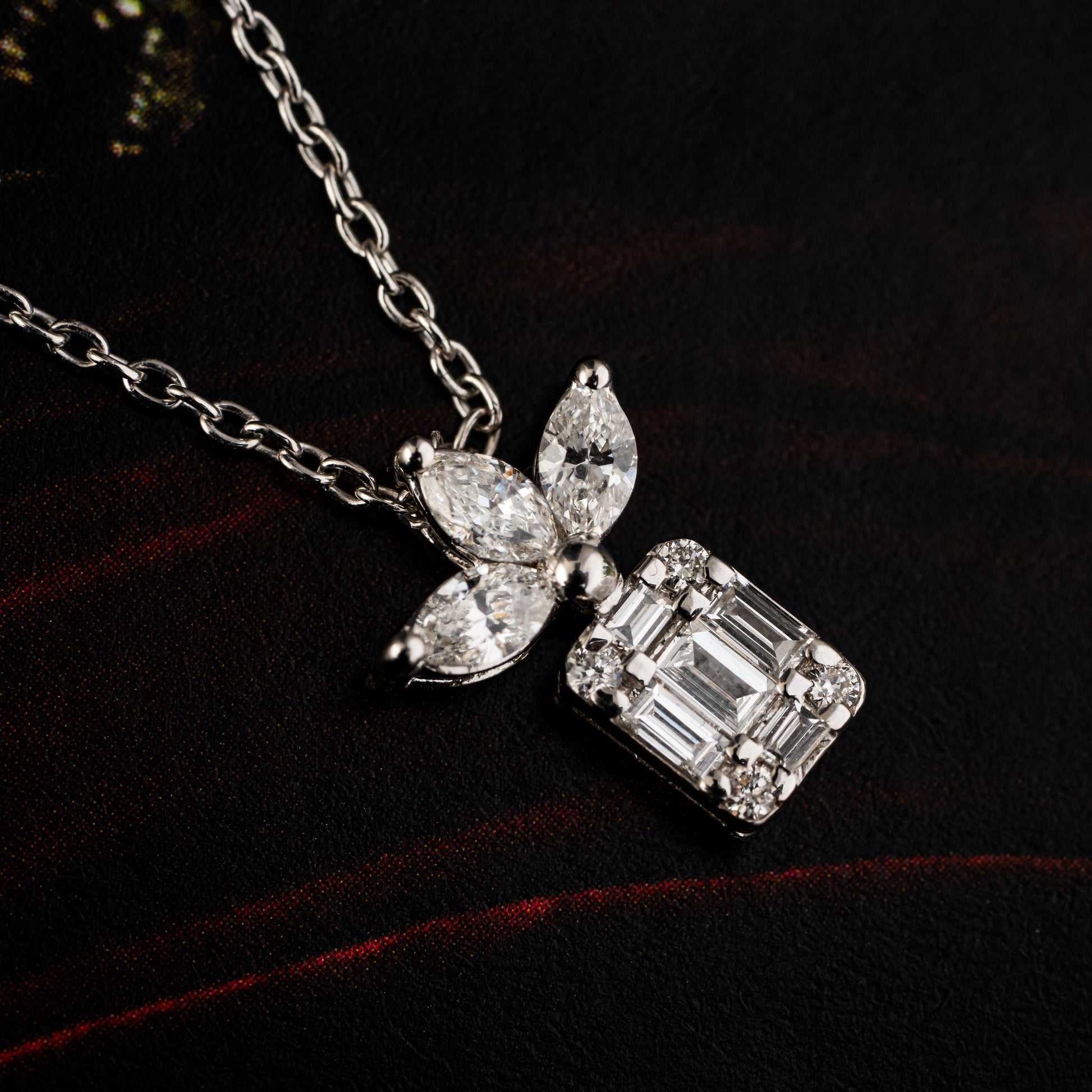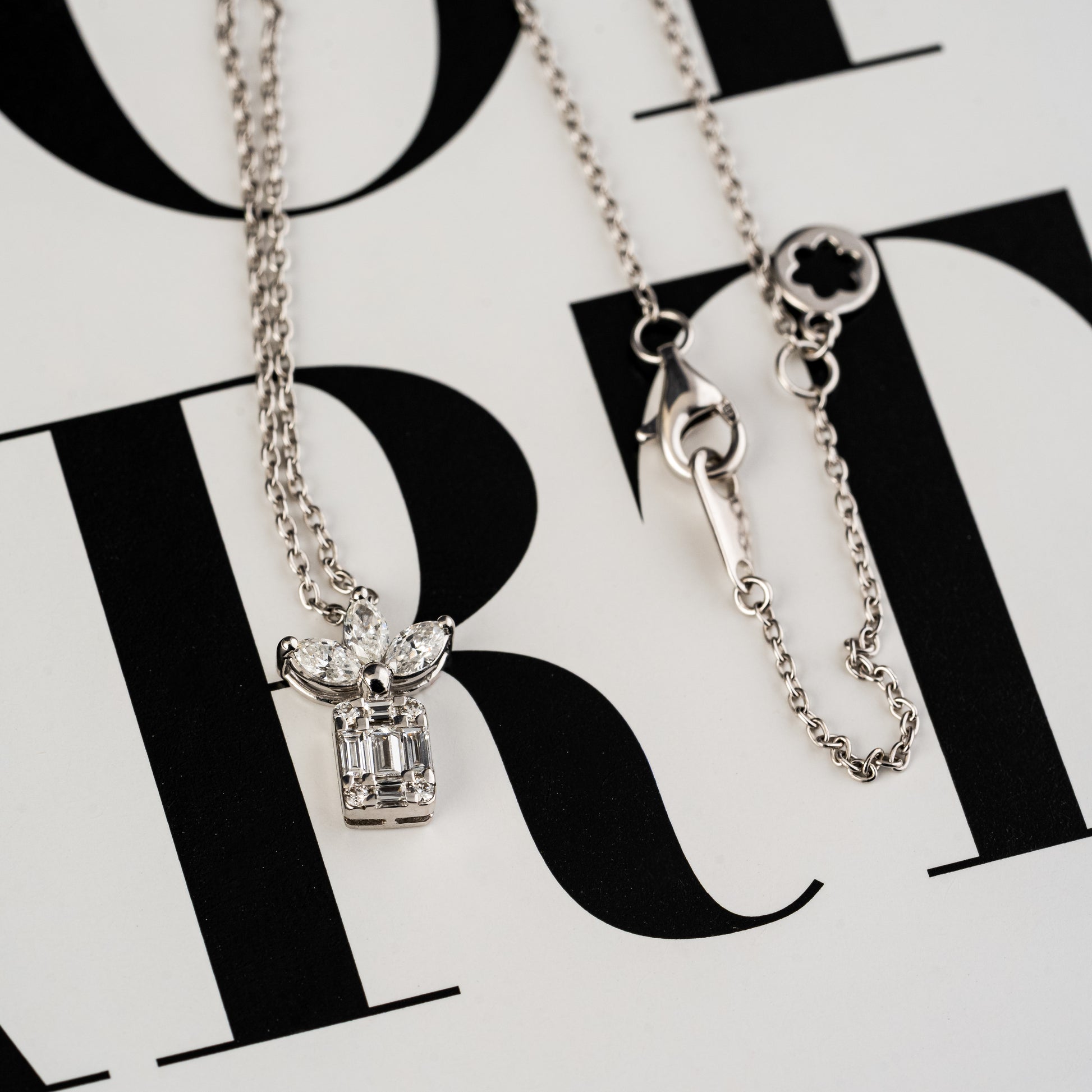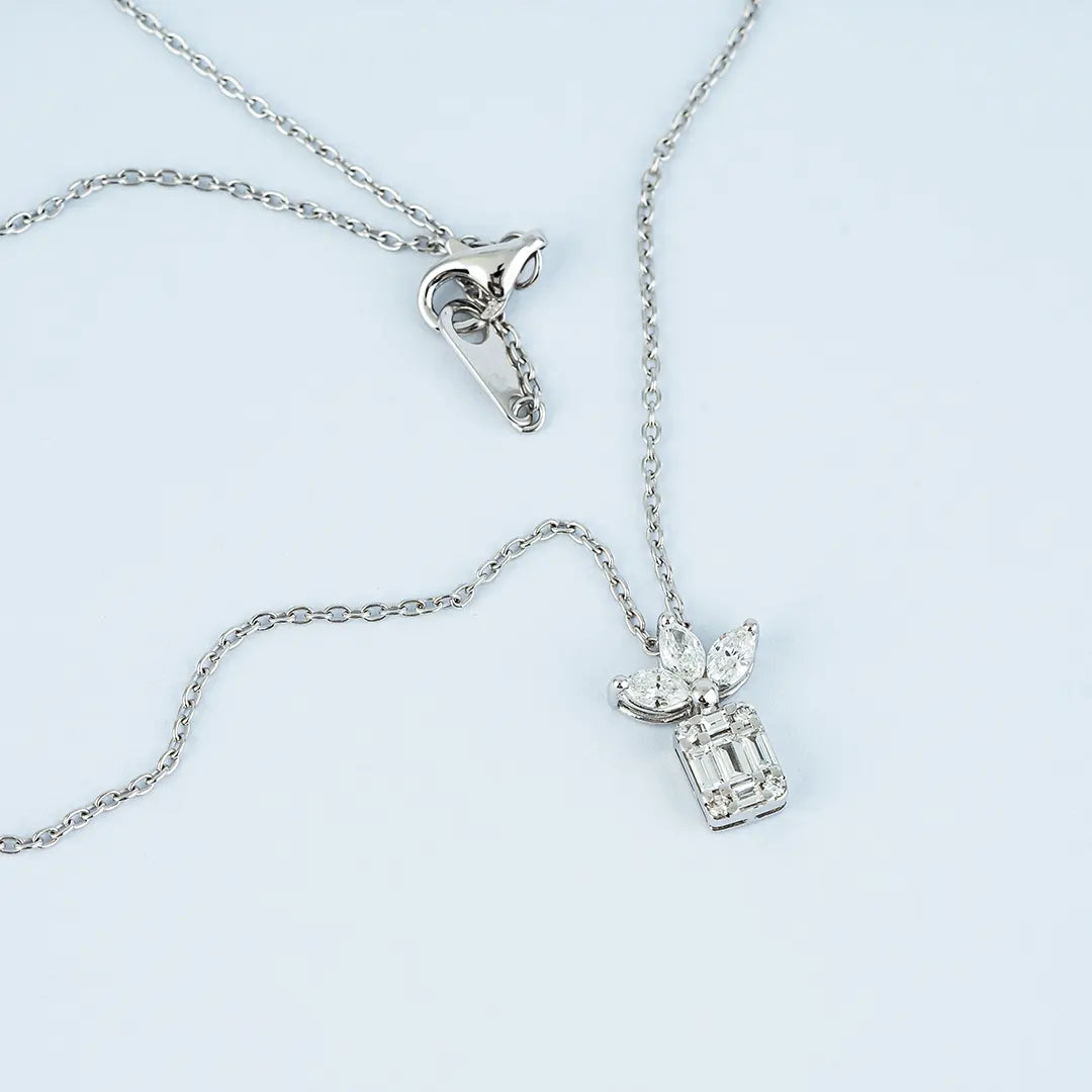 The necklace features a stunning diamond pendant set in a delicate white gold chain. showcasing a rectangular-shaped center surrounded by smaller marquise-cut diamonds arranged in a symmetrical pattern. The combination of the baguette-cut and marquise-cut diamonds creates a captivating and elegant design.